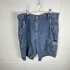 This product is a pair of vintage Wrangler men's blue denim shorts in size 34 waist. Made from cotton denim, they feature a classic 5-pocket design with a zip closure and a medium wash. These casual shorts have a regular fit and are machine washable, making them a practical and stylish addition to any wardrobe. Perfect for a summer day out or a relaxed evening look, these Wrangler shorts are a nod to 90s style with a timeless blue colour and Wrangler logo accents.