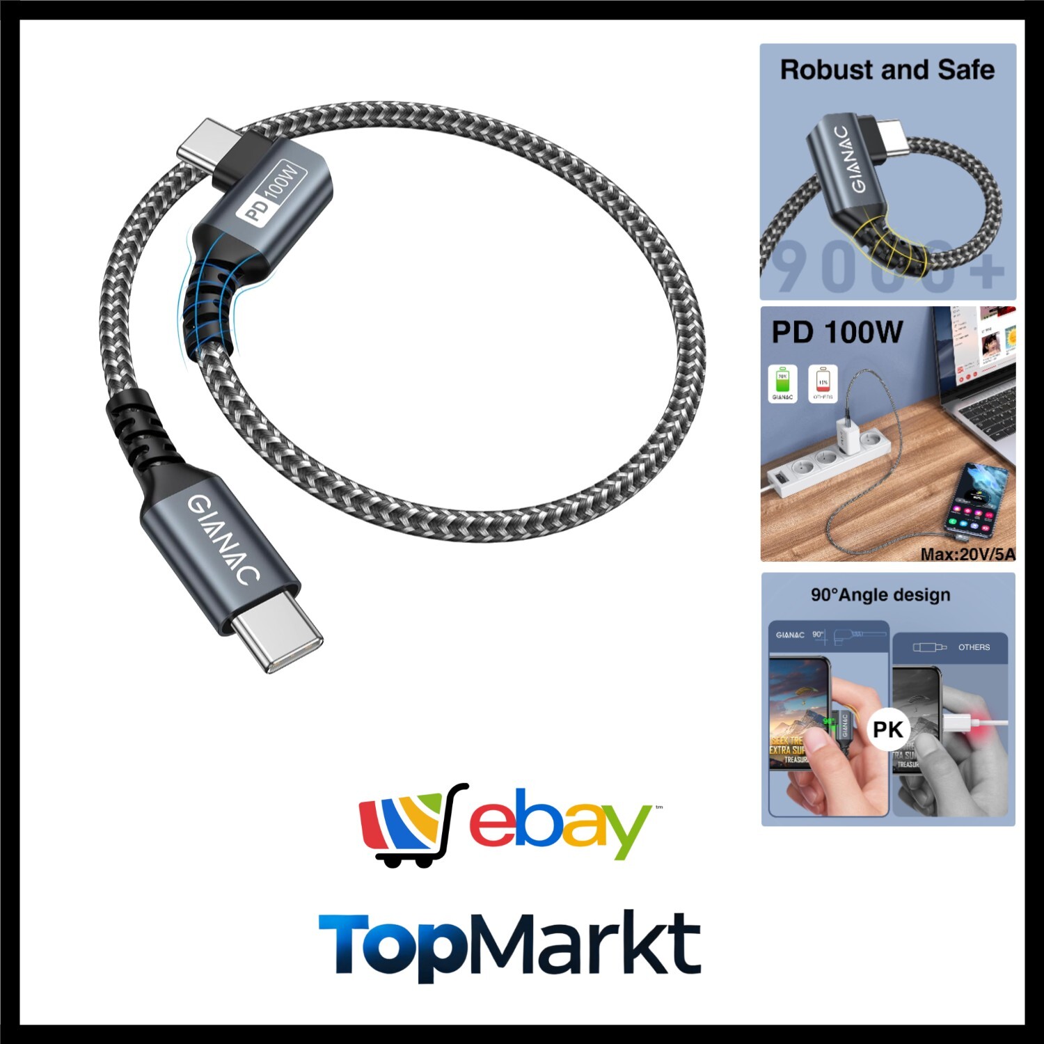 100W USB C auf USB C Kabel Kurz 0.3M,90 Grad Schnellladekabel USB C PD 5A USB...