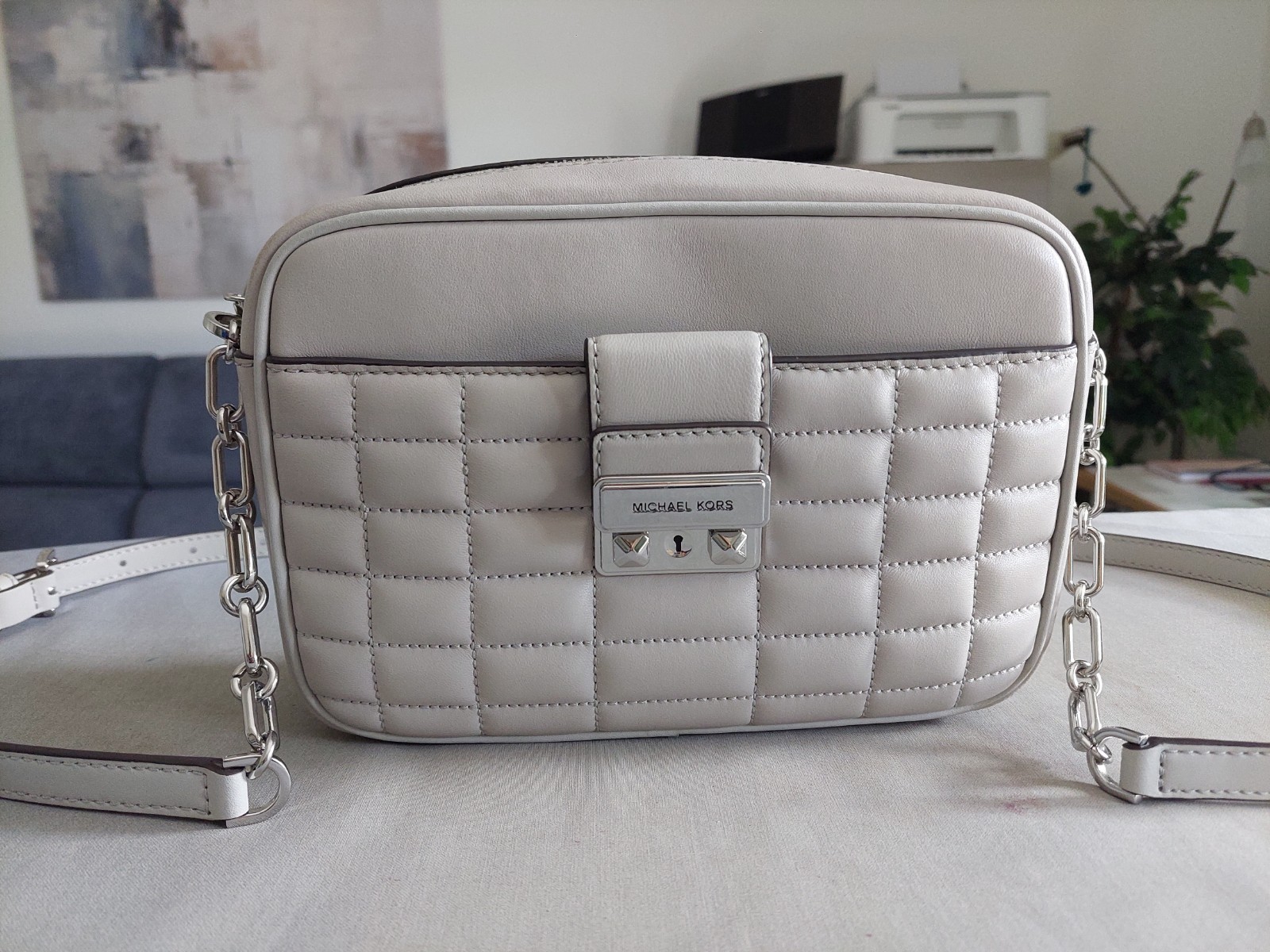 Elegante Michael Kors Umhängetasche für Damen aus echtem Leder in einem edlen hellgrau. Minimale Gebrauchsspuren an der Schnalle vorne. Die Schnalle ist Zierde und hat keine Funktion.Vorne gibt es außen ein Steckfach. Die Tasche hat einen langen Riemen und kann Cross Body getragen werden.Der Henkel hat an beiden Seiten silberfarbene Kettenglieder. Ein Staubbeutel wird mitgeliefert, ebenfalls das Echtes-Leder-Zertifikat. Maße:23 cm breit15 cm hoch 7 cm breit Bei Fragen gerne melden.