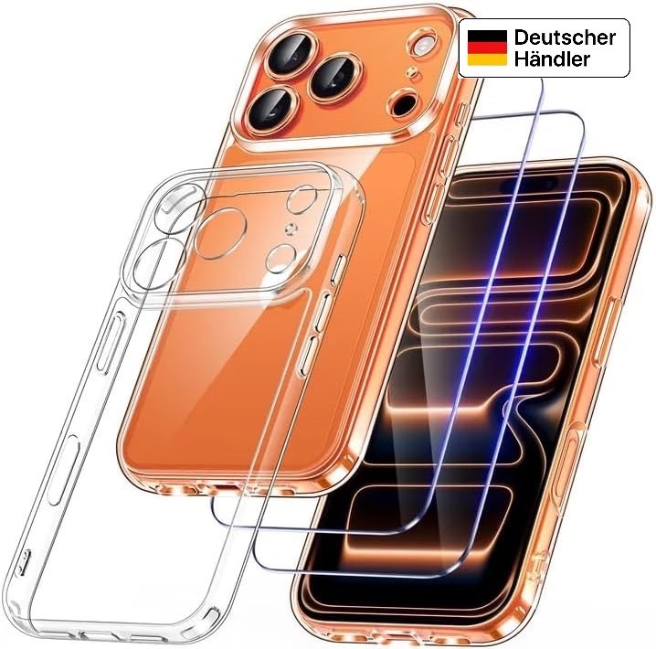 2× 9H Panzerglas Displayschutz. Schütze dein iPhone 17 Pro optimal mit diesempraktischen Komplett-Set. Hülle + 2x Schutzglas für Apple iPhone 17 Pro – 9H Panzerglas Set. Perfekte Passform – alle Tasten & Anschlüsse frei zugänglich.