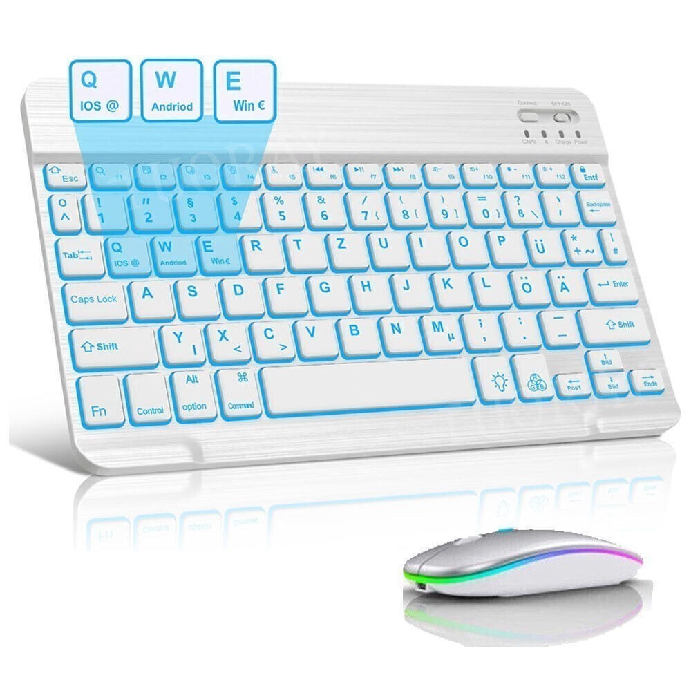 1 Stk.USB Ladekabel. QWERTZ Bluetooth Tastatur Maus Kompatibel mit Android/Windows/iPad iOS Tablet DE. Die Reichweite beträgt bis zu 10m/33ft. RGB QWERTZ Tastatur mit Hintergrundbeleuchtung. Bluetooth-Maus und -Tastatur können gleichzeitig mit dem iPad verbunden werden.