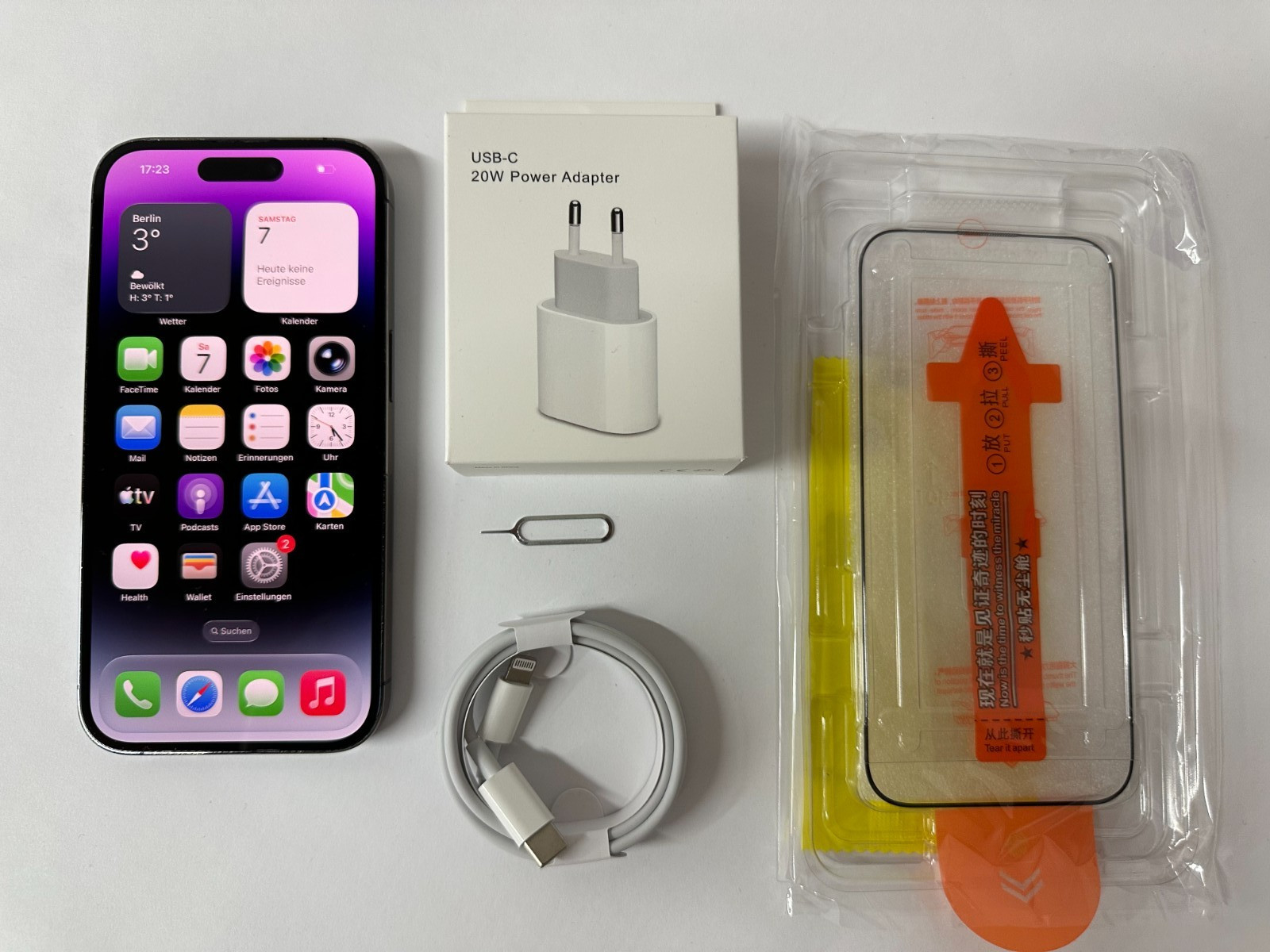 Apple iPhone 14 Pro A2890 - 128GB - Dunkellila Ohne Simlock. USB-Ladekabel (Zubehör). Akku wurde ausgetauscht Batteriezustand 100% siehe Foto. Netzteil 20 Watt (Zubehör). 12 Monate Händler Gewährleistung.