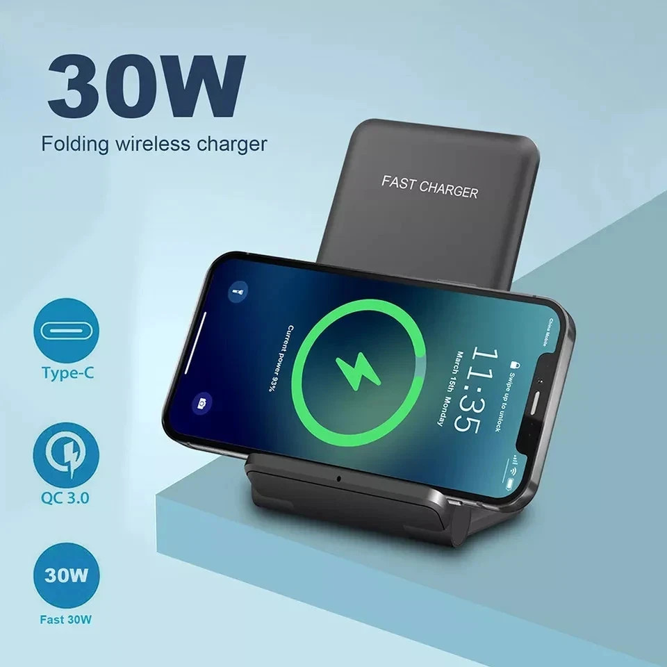 🔋Fast & Wireless Qi Charging up to 30W. Supports 5W / 7.5W / 10W / 15W / 20W / 30W – automatic power detection for iPhone, Samsung, Huawei, Xiaomi, and more. 1× 30W Qi Wireless Charging Stand (Black).