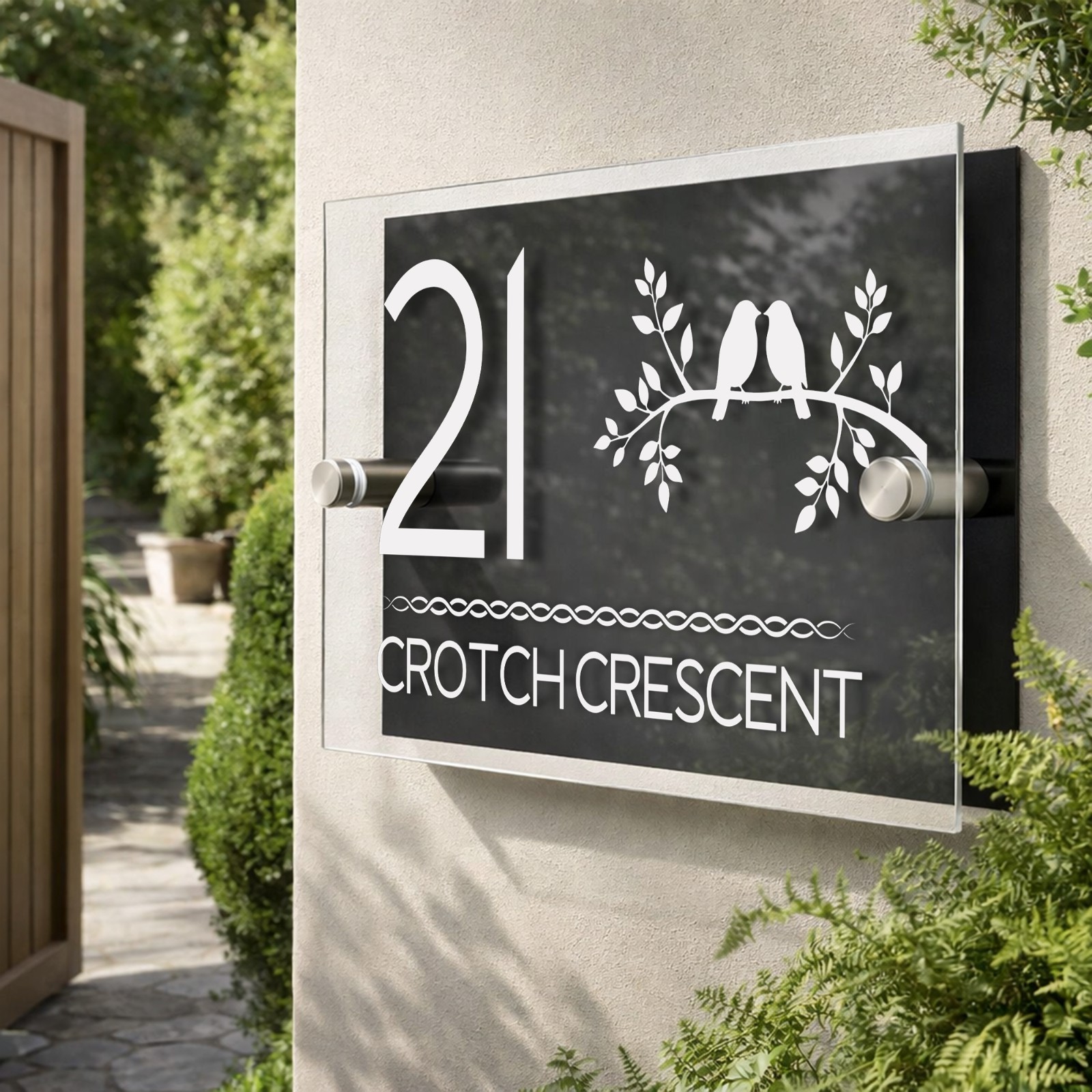 Our dual-layer acrylic house sign pairs a crystal-clear acrylic front panel — a combination that looks high-end and lasts for years outdoors. Material Acrylic back plate with clear acrylic front plate.