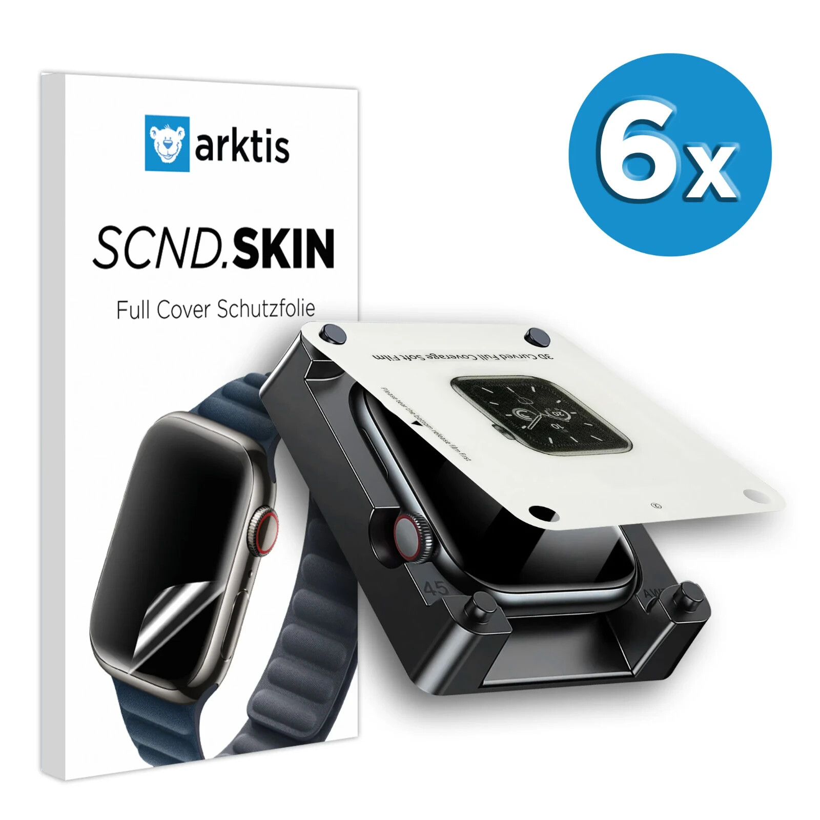 Unsere beste und zugleich unauffälligste Folie für deine Apple Watch: Die SCND.SKIN Schutzfolie von arktis schützt die komplette Vorderseite deiner Watch und lässt sich dank des integrierten Applikators super einfach anbringen.