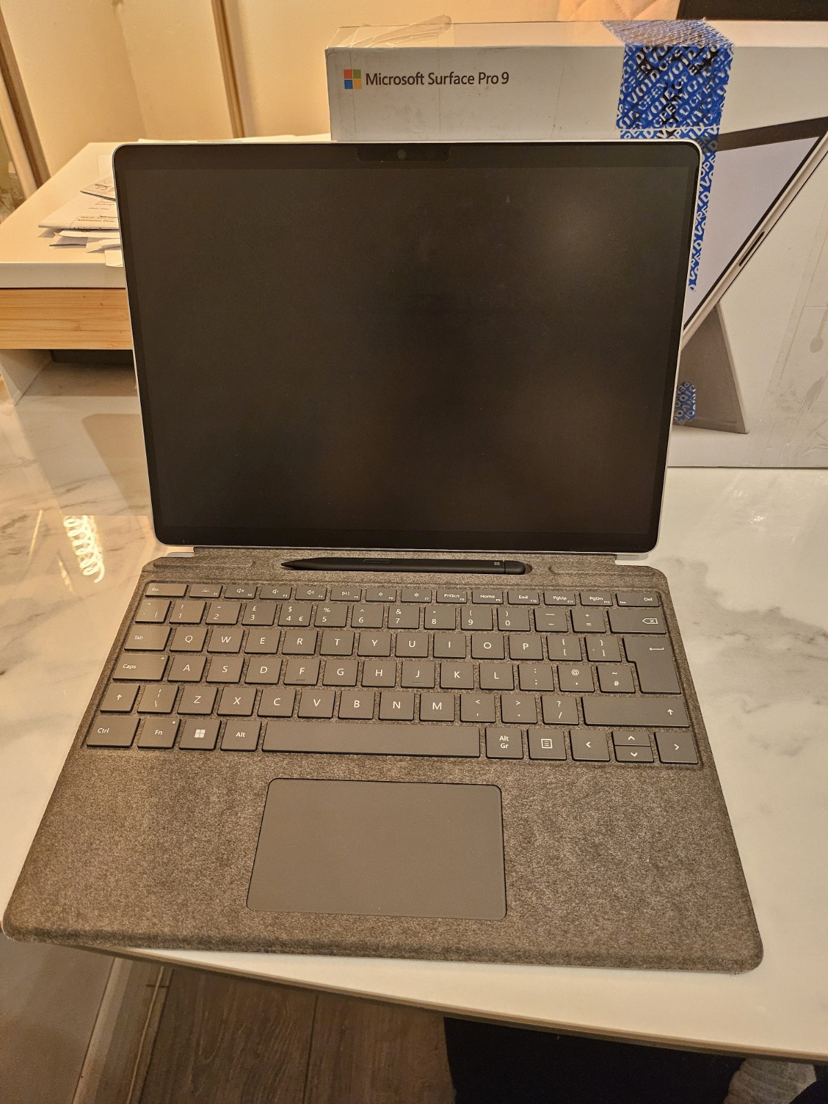 Surface Pro 9 8GB RAM 256GB SSD. Keyboard Type Cover and Slim Pen 2 included. It runs smoother on Windows 10. It includes a paper-like screen protector to give it a matt finish, but also makes it feel like writing on paper.