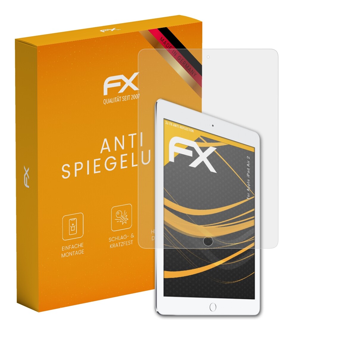Entspiegelnd und stoßdämpfend: atFoliX 2 x FX-Antireflex Schutzfolie für Apple iPad Air 2 - Made in Germany! Verkauf und Versand durch @FoliX - Original und direkt vom Hersteller! Montage Zubehör inklusive: Reinigungstuch, Montagewerkzeug (Rakel), Link zur mehrsprachigen, bebilderten Montageanleitung (inkl. Montagevideo).