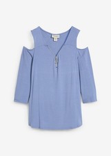 Farbe: Mattblau. Rückenausschnitt: Rundhals-Ausschnitt. Cold-Shoulder-Shirt aus fließender Viskose Modernes Shirt mit Cut-Outs und Reißverschluss. Ausschnitt: V-Ausschnitt. Material: Obermaterial: 95% Viskose (verifiziert), 5% Elasthan.