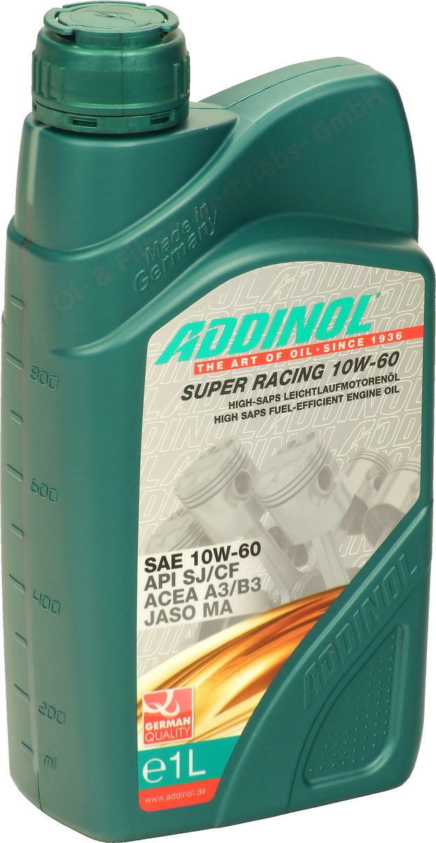 ADDINOL Super Racing 10W-60 ist ein Leichtlauföl der SAE-Klasse 10W-60. • Ebenfalls geeignet für alle Motorräder mit luft- und wassergekühlten Viertakt-Motoren im Straßen- und Geländebetrieb bei vorgeschriebener SAE-Klasse 10W-60 und entsprechender JASO-, ACEA- oder API-Spezifikation.