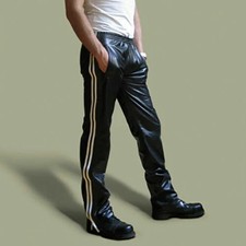 Herren Echt Schwarz Leder Jogginghose Track Style Weiß Streifen Elastische Ta...