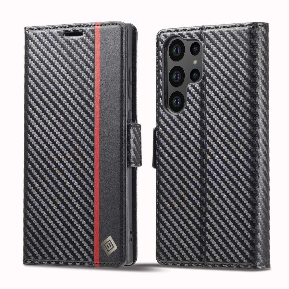 Praktische Aufbewahrung - Die Innenseite der Klappe bietet Platz für drei Karten und das seitliche Fach für Bargeld oder Notizen. Modernes Aufklapp-Etui mit Karbon-Muster und glattem Kunstleder für einen eleganten Look.