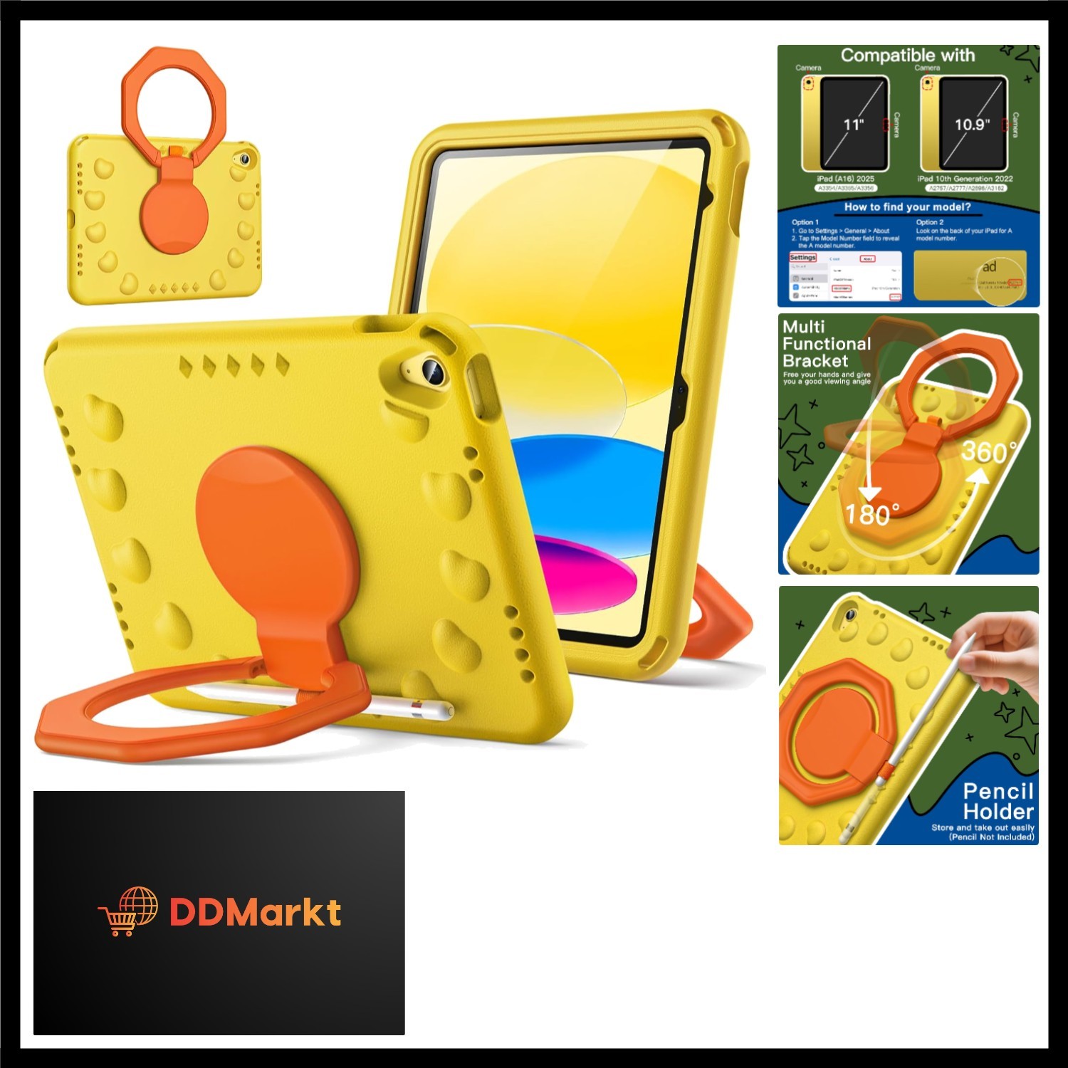 [Ringgriff] Das Design des Ringgriffs macht es für Kinder einfacher zu tragen und zu benutzen. Kinder Hülle für iPad A16 11. Generation 2025/2022 mit 360 Grad Drehbar Griff Ständer, Stoßfest Leichte Tablet Abdeckung mit Stifthalter Gelb.