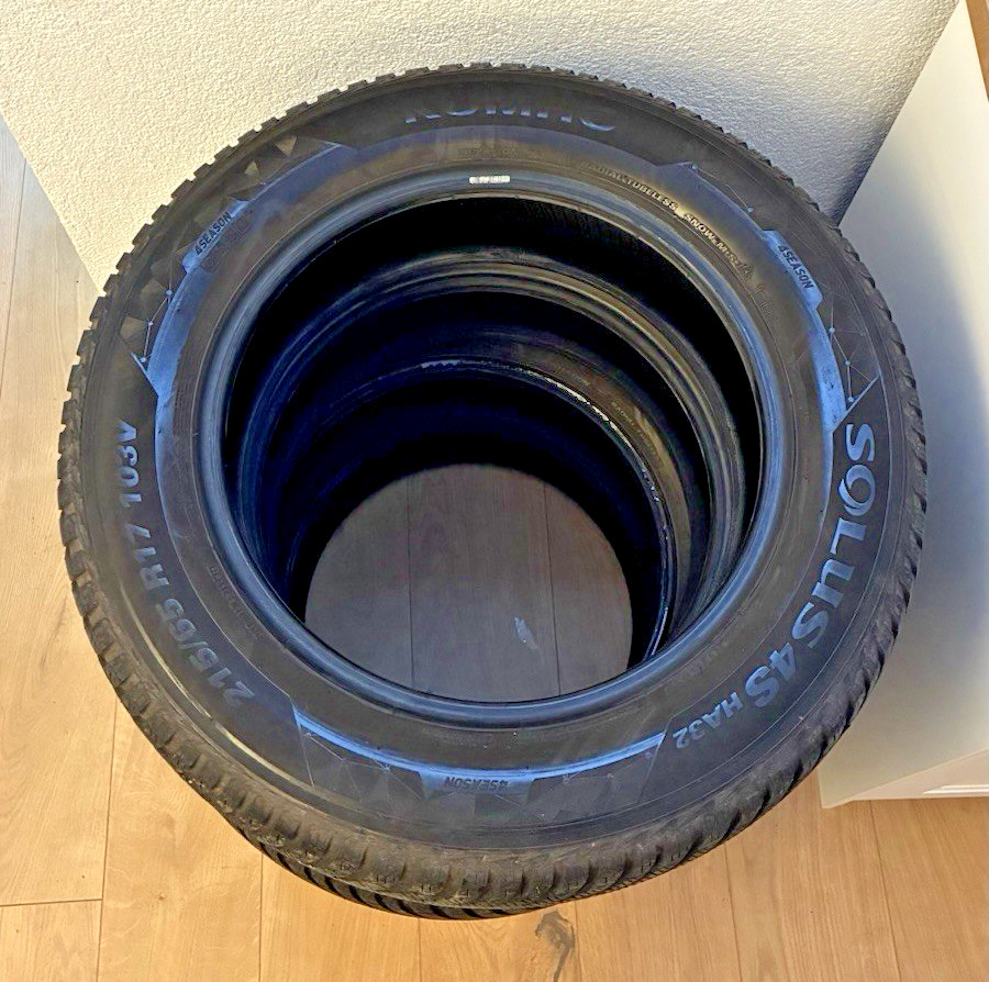 Zum Verkauf steht ein Satz Allwetterreifen der Marke KUMHO, Modell SOLUS 4S HA32 in der Größe 215/65 R17 103V. Saison: Allwetterreifen. Marke / Modell: KUMHO SOLUS 4S HA32. Die Reifen wurden im Januar 2025 neu gekauft und nur kurzzeitig genutzt.