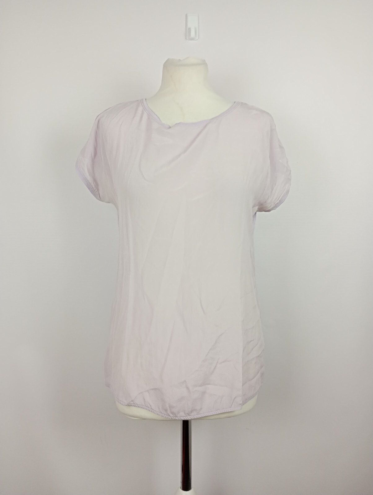 Fliederfarbenes T-Shirt von Hallhuber in der Größe M. Der vordere Stoff ist leicht durchsichtig.