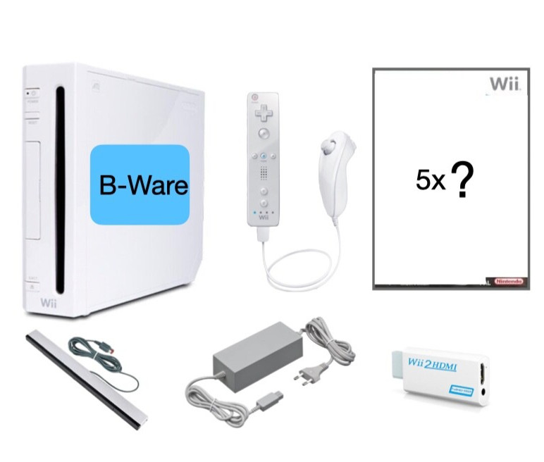 HDMI-Adapter, Netzteil & Sensorleiste. Alle Konsolen befinden sich in einem B-Ware Zustand. Nintendo Wii Konsole in weiß (B-Ware). Die CDs der Spiele können Kratzer aufweisen, die allerdings beim Spielen nicht stören.