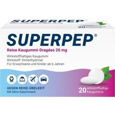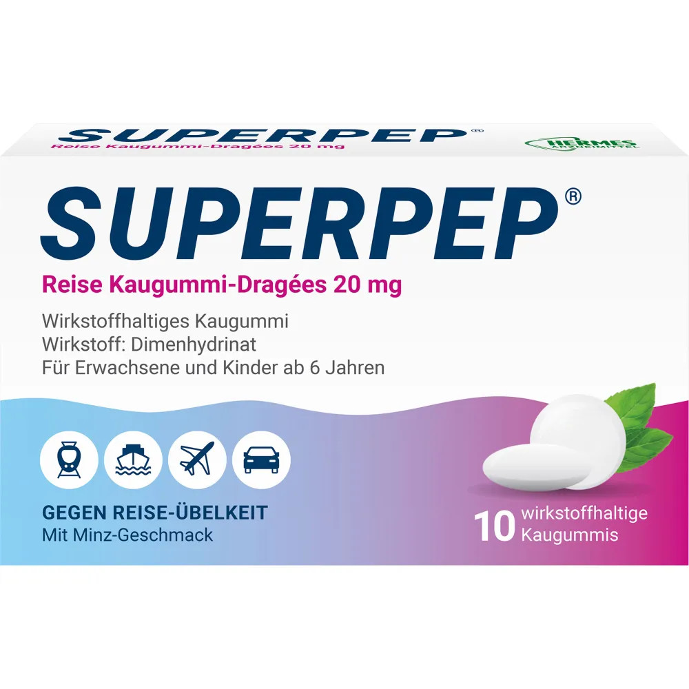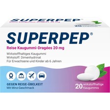 SUPERPEP Reise Kaugummi Dragees 20 mg - Effektive Hilfe gegen Reiseübelkeit 10 Stück. Entdecken Sie SUPERPEP Reise Kaugummi Dragees 20 mg für effektive Hilfe gegen Reiseübelkeit. 3mal je 1 Kaugummi im Abstand von jeweils 1/2 Stunde.