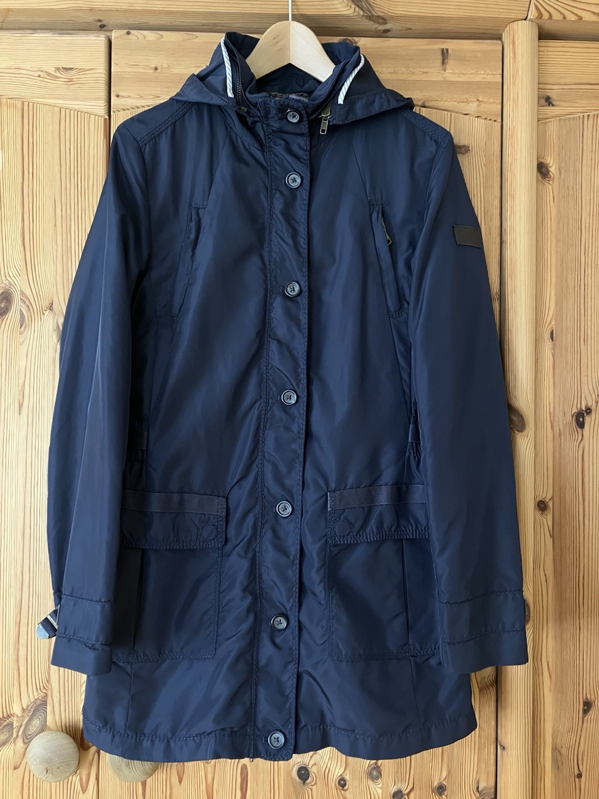 Der Mantel ist perfekt für den Übergang, da er nicht gefüttert ist und auch einen Schauer gut aushält. Je nach Wetterlage lässt sich die Kapuze abnehmen. Außerdem sind die vielen Taschen sehr praktisch und er ist tailliert geschnitten.