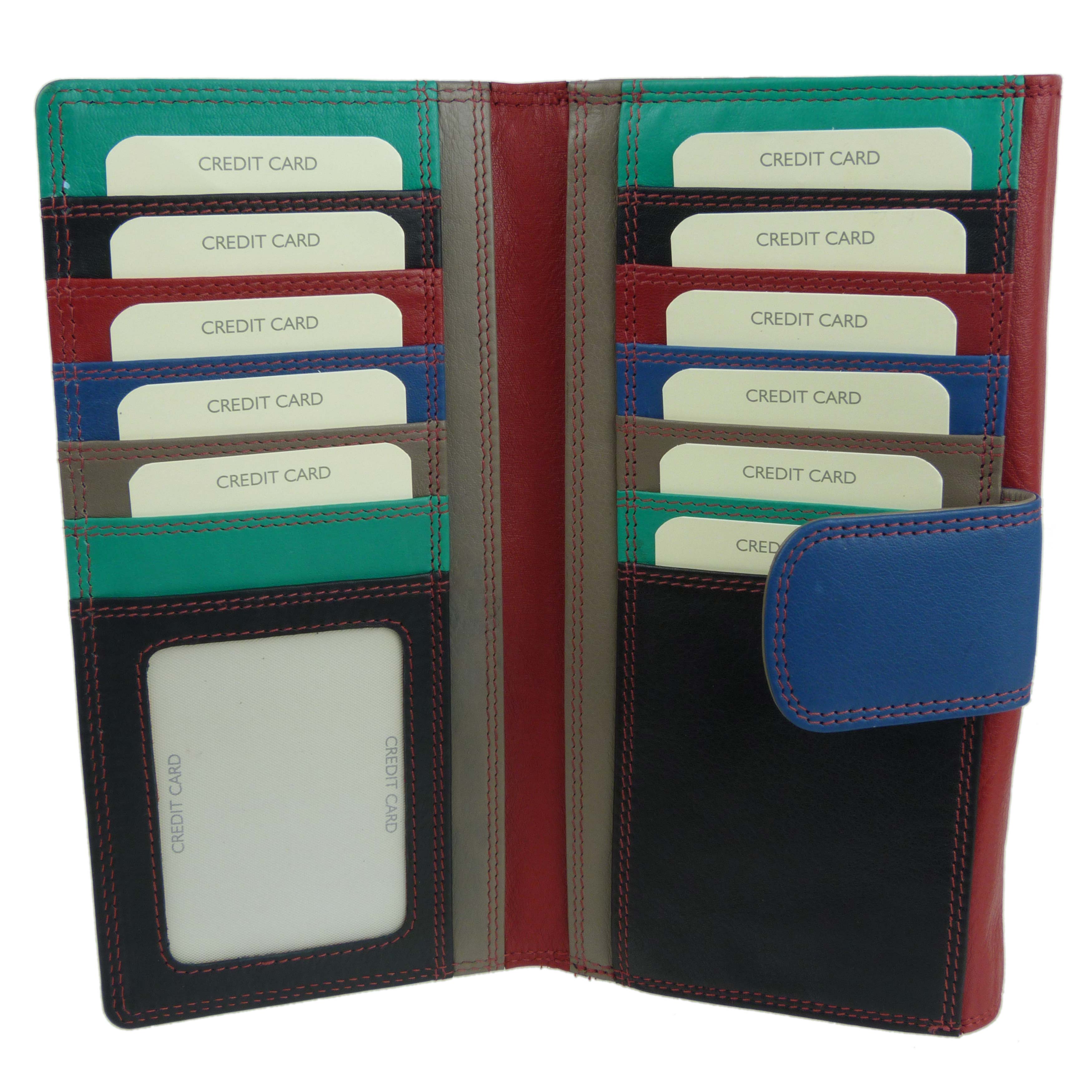 Hinter der Klappe verbergen sich 10 Kreditkartenfächer, ein zusätzliches Einsteckfach und ein großes Reißverschlussfach für Kleingeld. An der Seite mit Lasche befinden sich weitere 11 Kreditkartenfächer, ein Sichtfenster für Foto/Ausweis und vier Einsteckfächer.