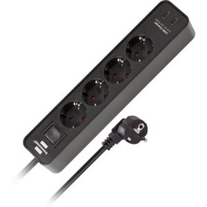 Ecolor Steckdosenleiste 4-fach mit 2 USB-Ladebuchsen; 1,5 m Kabellänge H05VV-F 3G1,5; 2x USB C Ladebuchsen 5V/3.10A, 15.5W; beleuchteter Sicherheitsschalter zum Ein- und Ausschalten (zweipolig); Schutzkontakt-Steckdosen in 45°-Anordnung; Farbe: Schwarz; Abmessungen (LxBxH): 5,8 x 8,0 x 31,0 cm; Gewicht: 440 g
