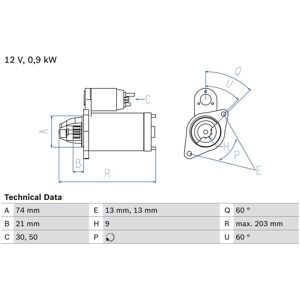Anzahl der Gewindelöcher [Stück]: 1. Anzahl der Löcher [Stück]: 1. Anzahl der Zähne [Stück]: 9. Drehrichtung: Im Uhrzeigersinn. Flanschendurchmesser [mm]: 82,5. Hersteller: BOSCH. Herstellernummer: 0 986 018 340. Index: 0 986 018 340. Länge [mm]: 231. Nennleistung [kW]: 1,4. Spannung [V]: 12. Zustand: Runderneuert.