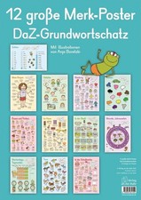 Organisationsmaterial für den DaZ-Unterricht an Grundschulen, Klasse 1, 2, 3, 4 +++ „Ich muss auf die Toilette!“ Eigentlich ein einfacher Satz – es sei denn, man stammt aus Syrien, Serbien, Eritrea oder beispielsweise Afghanistan. Geringste Bedürfnisse können da schon mal große Sorgen bereiten. Damit sich Kinder aus diesen Ländern dennoch im Schulalltag zurechtfinden, ihre Bedürfnisse mitteilen können und vor allem schnell die deutsche Sprache lernen, veranschaulichen diese zwölf großen DaZ-Poster anhand von Bild-Wort-Zuordnungen die wichtigsten Vokabeln des deutschen Grundwortschatzes. Deutsch-Anfänger finden auf einen Blick wichtige Wörter und erste Sätze. Alle Nomen sind zudem mit Artikeln und der Mehrzahlform versehen. Einfache Frage-Antwort-Sätze ermöglichen zudem direktes Arbeiten am Poster und erweitern den Wortschatz spielerisch. Auf den 12 Postern zu den Themen „Mein Körper“, „Gefühle“, „Kleidung“, „Farben“, „Zahlen“, „Essen und Trinken“, „im Haus“, „in der Stadt“, „Monate und Jahreszeiten“, „Wochentage und Tageszeiten“, „in der Schultasche“ und „Tiere“ werden über 200 Begriffen bildlich dargestellt. So werden kleine Bedürfnisse nicht zu großen Problemen!