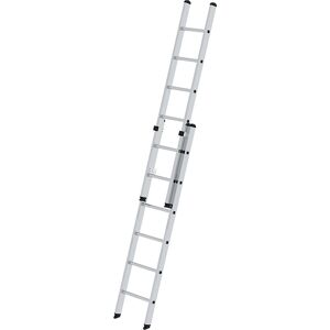 Anlegeleiter höhenverstellbar, Schiebeleiter, 2-teilig, 2 x 6 Sprossen, Holm 73 x 25 mm. Anlieferung = montiert. Ausführung Aufstieg = Sprossen. Sprossenanzahl = 2x6 Stück. Breite = 420 mm. Arbeitshöhe = 4,10 m. Tragfähigkeit = 150 kg. Gestellmaterial = Aluminium. Länge ausgezogen = 2960 mm. Länge zusammengeschoben = 1940 mm. Sprossenmaterial = Aluminium, geriffelt. Sprossentiefe = 30 mm. Holmhöhe = 73 mm. Holmbreite = 25 mm. Produkttyp = Schiebeleitern. Hochstabile Rechteckrohr-Holme. Dauerhafte Sprossen-Holm-Verbindung durch Qualitätsbördelung. Sicherer Stand durch beidseitig geriffelte Vierkantsprossen, 30 x 30 mm. Rutschsichere nivello®-Füße für beste Bodenhaftung, Flexibilität und Sicherheit. Stabile, korrosionsbeständige Führungsbeschläge, automatisch einrastende Abhebesicherung, Oberleiter von Sprosse zu Sprosse verstellbar. Ab 2 x 14 Sprossen mit Wandlaufrollen. Leiternbreite 420 mm.