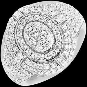 Der Élixir Ring begeistert mit seinem harmonischen Design, das mit synthetischen Diamanten besetzt ist. Das zentrale, kreisförmige Motiv, umgeben von einer funkelnden Aura, erinnert an die Reinheit und das Geheimnis eines kostbaren Elixiers. Weißgold (375/-): 8.4 g.Labordiamant : 140 - Total: 1.29 Karat