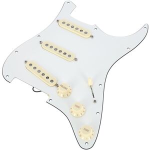 Fender Pre-Wired Strat Pickguard Vintage Noiseless SSS; 3-lagiges, vorverdrahtetes Stratocaster Schlagbrett; 3x Vintage Noiseless Single-Coil Strat Tonabnehmer; Polysol-beschichteter Magnetdraht; Versetzte, handgefaste Polstücke für einen glatten, ausgewogenen Klang; Alnico 2 Magnete erzeugen komplexe Obertöne mit wärmeren Angriffen und weniger aggressiven Mitten; Vintage Single Coil Strat Ton ohne Brummen; vinylbeschichteter Ausgangsdraht und Kunststoffspule; Regler: Master Volume (CTS 500K), Tone 1. (Hals Tonabnehmer), Tone 2. (Steg/Mitte Tonabnehmer) (CTS 1 MEG); Schalter: 5-Wege; Farbe: Parchment
