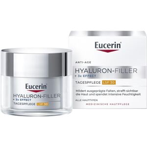 Die Eucerin Hyaluron-Filler + 3x Effect Tagespflege LSF 30 50 ml kombiniert Anti-Aging-Wirkung mit intensivem UV-Schutz. Die leistungsstarke Formel mit hochdosierter Hyaluronsäure und antioxidativem Glycin-Saponin polstert Falten sichtbar auf und aktiviert die hauteigene Produktion von Hyaluronsäure und Kollagen. So wird die Haut nachhaltig geglättet und gestärkt – für ein jüngeres, strahlendes Hautbild. Mit Lichtschutzfaktor 30 und UVA-Schutz bewahrt die Tagescreme die Haut vor lichtbedingter vorzeitiger Hautalterung und freien Radikalen. Die schnell einziehende, nicht komedogene Textur eignet sich auch als Make-up-Grundlage. Klinisch bestätigt: 98 % der Anwender*innen berichten von sichtbar reduzierten Falten, einem glatteren, strafferen Hautgefühl und ein verjüngtes Aussehen der Haut.* Die Produktvorteile: Anti-Aging Creme für ausgeprägte Falten Mit Hyaluronsäure und Glycin-Saponin zur Glättung und Straffung der Haut Spendet intensive Feuchtigkeit Mit LSF 30 und UVA-Schutz gegen lichtbedingte Hautalterung Schnell einziehend, ideal als Make-up-Basis Hauttyp: Für alle Hauttypen geeignet Anwendung: Morgens auf das gereinigte Gesicht, Hals und Dekolleté auftragen Sanft einmassieren, Augenkontakt vermeiden Für optimale Ergebnisse in Kombination mit dem Eucerin Straffenden Serum und der Nachtpflege verwenden Zusätzlichen Sonnenschutz bei intensiver Sonneneinstrahlung mit Eucerin Photoaging Control Face Sun Fluid LSF 50+ ergänzen *Anwendungsstudie mit 120 Teilnehmer*innen, Ergebnisse nach 2 und 4 Wochen regelmäßiger Anwendung Zusammensetzung: Aqua, Glycerin, Alcohol Denat., C12-15 Alkyl Benzoate, Butyl Methoxydibenzoylmethane, Butylene Glycol Dicaprylate/Dicaprate, Ethylhexyl Salicylate, Bis-Ethylhexyloxyphenol Methoxyphenyl Triazine, Cetearyl Alcohol, Dibutyl Adipate, Ethylhexyl Triazone, Phenylbenzimidazole Sulfonic Acid, Tapioca Starch, Behenyl Alcohol, Sodium Hyaluronate, Glycine Soja Germ Extract, Glycyrrhetinic Acid, Glyceryl Stearate, Sodium Hydroxide, Sodium Stearoyl Glutamate, Xanthan Gum, Carbomer, Acrylates/C10-30 Alkyl Acrylate Crosspolymer, Dimethicone, Trisodium EDTA, Ethylhexylglycerin, Phenoxyethanol, Parfum