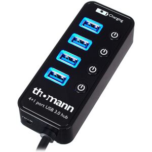 Thomann 4+1 Port USB 3.0 Hub; USB 3.0 Hub; 4 x USB 3.0 Anschlüsse (bis 5 GBit/s) + 1 Schnellladeport; Länge des Anschlusskabels (Typ A): 1 m; Ein/Aus-Schalter und Status-LED pro Port (1-4); Abmessungen (Hub): 105 x 44 x 24 mm
