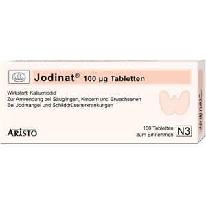 Anwendungsgebiet von Jodinat 100μgDas Präparat ist ein Spurenelement, das sowohl für die Bildung von Schilddrüsenhormonen als auch für eine normale Schilddrüsenfunktion erforderlich ist. Es wird normalerweise mit der Nahrung aufgenommen, hohe Konzentrationen findet man in Fisch und Meerestieren und in Milchprodukten. Bei nicht ausreichender Iodversorgung kann es zu einer verringerten Bildung von Schilddrüsenhormonen und zur Entwicklung eines Kropfes kommen, sogar beim ungeborenen Kind. Kaliumiodid, der Wirkstoff in diesem Arzneimittel, kann eine unzureichende Iodversorgung ausgleichen.Es wird angewendetzur Vorbeugung eines Kropfes bei unzureichender Iodzufuhr über die Nahrung, insbesondere in Schwangerschaft und Stillzeit.zur Vorbeugung eines erneuten Kropfwachstums nach Abschluss einer Kropfbehandlung oder nach einer Kropfoperation - zur Behandlung eines Iodmangelkropfes bei Neugeborenen, Kindern und Jugendlichen.Wirkstoffe / Inhaltsstoffe / Zutaten130.8 µg Kalium iodid0.1 mg Iodid IonCarboxymethylstärke, Natriumsalz Typ A Hilfstoff (+)Cellulose, mikrokristallin Hilfstoff (+)Magnesium stearat Hilfstoff (+)Maisstärke Hilfstoff (+)Mannitol Hilfstoff (+)GegenanzeigenDas Arzneimittel darf nicht eingenommen werden,wenn Sie allergisch gegen Kaliumiodid oder einen der sonstigen Bestandteile dieses Arzneimittels sind,wenn Ihre Schilddrüse zu viel Schilddrüsenhormon produziert,wenn bestimmte Knoten oder Bezirke in der Schilddrüse vorliegen, die unkontrolliert Schilddrüsenhormone produzieren (sog. autonome Adenome, fokale oder diffuse Schilddrüsenautonomie).DosierungNehmen Sie das Arzneimittel immer genau nach der Anweisung ein. Bitte fragen Sie bei Ihrem Arzt oder Apotheker nach, wenn Sie sich nicht sicher sind.Die empfohlene Dosis beträgt:Ihre tägliche Dosierung ist abhängig von Ihrer ernährungsbedingten Iodversorgung und dem Grund, weswegen Sie das Arzneimittel einnehmen. Im Allgemeinen können die nachfolgenden Dosierungsempfehlungen als Richtwerte ge