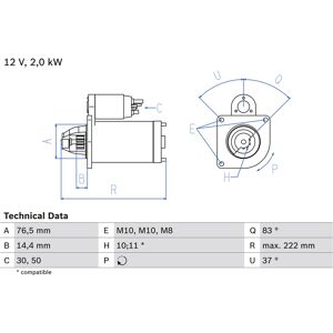 BOSCH Starter Anzahl der Gewindebohrungen: 1 Lage/Grad: links: ° Starterleistung: 0,7: kW Spannung: 12: V Zähnezahl: 9 Bohrung-Ø: 6 mm Klemme: 50 Befestigungswinkel [Grad]: 53: ° Anzahl der Befestigungsbohrungen: 2 Klemme: 30 Ritzel-Grundposition: 0,5 mm Drehrichtung: Drehrichtung im Uhrzeigersinn Gewindemaß 1: M10 Länge: 184 mm Winkelmaß Befestigungsbohrung [Grad]: 53: ° Flansch-Ø: 64 mm Winkelmaß Maulöffnung [Grad]: 37: ° Bohrung-Ø 3: 11 mm Austauschteil Starterausführung: eigengelagert , u.a. für Renault Clio I (5/357, B/C57), 1149 cm³, 58 PS (43 kW), 1/1996 bis 9/1998, KBA-Nr: 3004785Renault Twingo I (C06), 1149 cm³, 54 PS (40 kW), 5/1996 bis 3/2007, KBA-Nr: 3004780Renault Twingo I (C06), 1149 cm³, 58 PS (43 kW), 5/1996 bis 6/2007, KBA-Nr: 3004779Renault Kangoo (KC0/1), 1149 cm³, 58 PS (43 kW), ab 8/1997, KBA-Nr: 3004553Renault Clio II (BB, CB), 1149 cm³, 58 PS (43 kW), 9/1998 bis 2/2010, KBA-Nr: 3004566Renault Kangoo (FC0/1), 1149 cm³, 58 PS (43 kW), ab 8/1997, KBA-Nr: 3004006Renault Thalia II (LU), 1149 cm³, 75 PS (55 kW), ab 9/2008Renault Clio I (5/357, B/C57), 1870 cm³, 65 PS (48 kW), 5/1996 bis 2/1998Renault Modus / Grand Modus (F/JP0), 1149 cm³, 103 PS (76 kW), ab 4/2011, KBA-Nr: 3333AYURenault Clio III (BR0/1, CR0/1), 1149 cm³, 103 PS (76 kW), 9/2010 bis 12/2014, KBA-Nr: 3333AYSRenault Clio III (KR0/1), 1149 cm³, 103 PS (76 kW), 3/2010 bis 12/2012, KBA-Nr: 3333AYTRenault Twingo I (S06), 1149 cm³, 58 PS (43 kW), 5/1996 bis 8/2004Renault Clio I (5/357, B/C57), 1149 cm³, 54 PS (40 kW), 1/1996 bis 9/1998, KBA-Nr: 3004570Renault Twingo I (C06), 1149 cm³, 75 PS (55 kW), 1/2001 bis 6/2007, KBA-Nr: 3004129Renault Clio II (SB0/1/2), 1149 cm³, 58 PS (43 kW), ab 9/1998Renault Clio II (BB, CB), 1149 cm³, 75 PS (55 kW), 6/2001 bis 8/2016, KBA-Nr: 3004147Renault Kangoo (KC0/1), 1149 cm³, 75 PS (55 kW), ab 6/2001, KBA-Nr: 3004172Renault Kangoo (FC0/1), 1149 cm³, 75 PS (55 kW), ab 10/2001, KBA-Nr: 3004044Renault Twingo I (C06), 1149 cm³, 60 PS (44 kW), 8/2004 bis 6/2007Renault Modus / Grand Modus (F/JP0), 1149 cm³, 75 PS (55 kW), ab 12/2004, KBA-Nr: 3333091Renault Modus / Grand Modus (F/JP0), 1149 cm³, 65 PS (48 kW), ab 5/2005, KBA-Nr: 3333171Renault Clio III (BR0/1, CR0/1), 1149 cm³, 75 PS (55 kW), 6/2005 bis 12/2014, KBA-Nr: 3333159Renault Clio III (BR0/1, CR0/1), 1149 cm³, 78 PS (58 kW), 6/2005 bis 12/2011, KBA-Nr: 3333186Renault Clio III (BR0/1, CR0/1), 1149 cm³, 65 PS (48 kW), 6/2005 bis 12/2012, KBA-Nr: 3333185Renault Thalia I (LB), 1149 cm³, 75 PS (55 kW), ab 4/2002, KBA-Nr: 3333ABSRenault Clio III (BR0/1, CR0/1), 1149 cm³, 101 PS (74 kW), 5/2007 bis 12/2014, KBA-Nr: 3333AOZRenault Modus / Grand Modus (F/JP0), 1149 cm³, 101 PS (74 kW), ab 5/2007, KBA-Nr: 3333AOGRenault Kangoo (FC0/1), 1149 cm³, 58 PS (43 kW), 7/1998 bis 7/2001Renault Clio III (KR0/1), 1149 cm³, 75 PS (55 kW), 2/2008 bis 12/2012, KBA-Nr: 3333AQLRenault Clio III (KR0/1), 1149 cm³, 78 PS (58 kW), 11/2007 bis 12/2010, KBA-Nr: 3333AQHRenault Clio III (KR0/1), 1149 cm³, 101 PS (74...