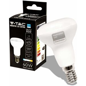 Lampe Chip LED Samsung SMD 4,8W E14 120 480LM kaltweies Licht 6500K. R50-Reflektorbirnenform aus thermoplastischem Material (mit undurchsichtiger Abdeckung) V-TAC PRO-Serie VT-250 - SKU 21140 Dieses Produkt hat eine Garantie von 5 Jahren. Art des Angriffs: E14 LED-Typ: Samsung SMD-LED-Chip Stromversorgung: 220-240 V, 50 Hz Leistung: 4,8 W Lichtfarbe: Kaltwei (6500K) Leistung (entspricht Glhlampe): ~ 40 W Material / Lampenabdeckung: Weier Thermoplast mit matter LED-Abdeckung. Lichtstrom: 470LM - 100LM / W Lichtstrahlffnung: 120 Abmessungen: 50x86 (H) mm Durchschnittliche Lebensdauer: 30.000h 5 Jahre Garantie. Energieklasse: F. Dimmbarkeit: NEIN CRI > 80 PF > 0,5