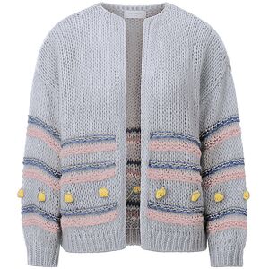 Damen Strickjacke aus Schurwoll-Mischung Rundhalsausschnitt Langarm Überschnittene Schultern Streifenmuster mit Pompoms Gerade Passform Farbbezeichnung: Ocean Blue Material: 40% Polyacryl, 30% Schurwolle, 30% Polyamid