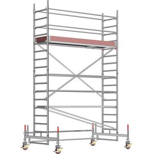 Universal-Fahrgerüst, Standard-Ausführung, Gerüsthöhe 4,58 m. Anlieferung = zerlegt. Plattformlänge = 2850 mm. Plattformbreite = 750 mm. Arbeitshöhe = 5.35 m. Standhöhe = 3350 mm. Material = Aluminium. Gewicht = 216.4 kg. Tragfähigkeit = 2 kN/m². Norm = DIN EN 1004-1. Höhe = 4.58 m. Produkttyp = Standardfahrgerüste. Leicht, robust, langlebig. Konzipiert für höchste Höhen. Spindelbare Rollen für Niveauausgleich. Sicherheit garantiert durch TÜV-Prüfung. Das Standard-Fahrgerüst für Arbeiten an der Wand und an der Decke, an Maschinen, in technischen Anlagen, Betriebs- und Lagerhallen, innen und außen. Standleitern (1,5 m breit) aus Aluminium sorgen für die einfache Steckmontage. Geländer und Diagonalen aus Aluminium rasten schnell ein. Arbeitsböden aus Aluminium-Rahmen und Sperrholz-Einlage als Durchstieg sorgen für einen gefahrlosen Innenaufstieg. Robuste Lenkrollen mit zentrischer Lasteneinleitung bieten nach der Arretierung besondere Standfestigkeit. Stahlspindeln ermöglichen einen einfachen Niveauausgleich in unebenem Gelände. Entspricht DIN EN 1004 - Belastbarkeit von 2 kN/m² (Gerüstgruppe 3). Bitte beachten Sie die Ballastierungsvorschriften der einzelnen Gerüstgrößen. Bitte beachten Sie die notwendige Ballastierung gemäß Aufbau- und Verwendungsanleitung.