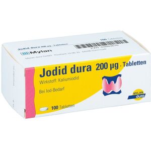 Anwendungsgebiet von Jodid dura 200μgDas Präparat ist ein Spurenelement, das sowohl für die Bildung von Schilddrüsenhormonen als auch für eine normale Schilddrüsenfunktion erforderlich ist. Es wird normalerweise mit der Nahrung aufgenommen, hohe Konzentrationen findet man in Fisch und Meerestieren und in Milchprodukten. Bei nicht ausreichender Iodversorgung kann es zu einer verringerten Bildung von Schilddrüsenhormonen und zur Entwicklung eines Kropfes kommen, sogar beim ungeborenen Kind. Kaliumiodid, der Wirkstoff in diesem Arzneimittel, kann eine unzureichende Iodversorgung ausgleichen.Es wird angewendetzur Vorbeugung eines Kropfes bei unzureichender Iodzufuhr über die Nahrung, insbesondere in Schwangerschaft und Stillzeit.zur Vorbeugung eines erneuten Kropfwachstums nach Abschluss einer Kropfbehandlung oder nach einer Kropfoperation zur Behandlung eines Iodmangelkropfes bei Neugeborenen, Kindern und Jugendlichen.Wirkstoffe / Inhaltsstoffe / Zutaten261.6 µg Kalium iodid200 µg Iodid IonKartoffelstärke Hilfstoff (+)Lactose 1-Wasser Hilfstoff (+)Magnesium stearat Hilfstoff (+)Maisstärke Hilfstoff (+)Silicium dioxid, hochdispers Hilfstoff (+)GegenanzeigenDas Arzneimittel darf nicht eingenommen werden,wenn Sie allergisch gegen Kaliumiodid oder einen der genannten sonstigen Bestandteile dieses Arzneimittels sind,wenn Ihre Schilddrüse zu viel Schilddrüsenhormon produziert,wenn bestimmte Knoten oder Bezirke in der Schilddrüse vorliegen, die unkontrolliert Schilddrüsenhormone produzieren (sog. autonome Adenome, fokale oder diffuse Schilddrüsenautonomie).DosierungNehmen Sie dieses Arzneimittel immer genau wie in der Gebrauchsinformation beschrieben bzw. genau nach der mit Ihrem Arzt oder Apotheker getroffenen Absprache ein. Fragen Sie bei Ihrem Arzt oder Apotheker nach, wenn Sie sich nicht sicher sind.Die empfohlene Dosis beträgt:Ihre tägliche Dosierung ist abhängig von Ihrer ernährungsbedingten Iodversorgung und dem Grund, weswegen Sie das Arzneimittel