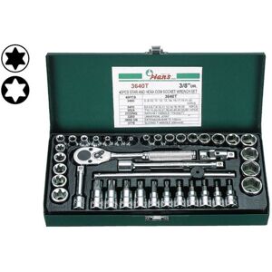 Anzahl der Werkzeuge: 40. Buchse [Zoll]: 3/8. Hersteller: HANS. Herstellernummer: 3640T. Index: 3640T. Metergröße [mm]: 10; 11; 12; 13; 14; 15; 17; 19; 21; 22; 6; 8. Profil: 6-eckig. TORX / PENTACLE Größe: E10, E11, E12, E14, E16, E18, E20, E4, E5, E6, E7, E8. TORX Größe: T10, T15, T20, T25, T27, T30, T40, T45, T50, T55, T60. Verpackung / Lagerung: in einer Metallbox. Werkzeugtyp: Buchse/Sechskant, Buchse/Stift (TORX), Gelenk, Kappe E-TORX, Knopf, Rassel.